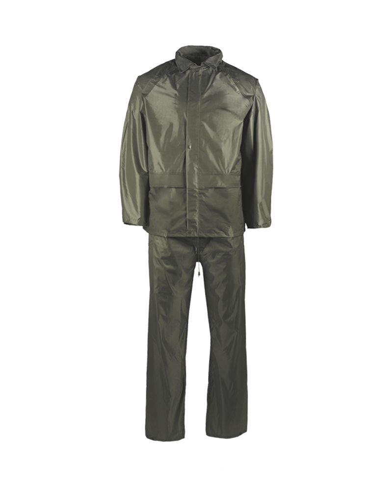 Sadepuvun takki ja housut 100 % polyesteriä, erittäin kevyet, pakattu pieneen vetoketjulliseen pussiin.