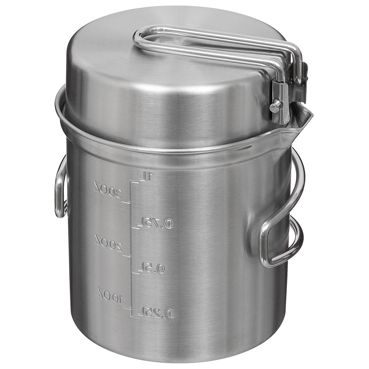 1 kastrull ,mått 12,5 cm x 12,5 cm med måttskala invändigt till 1 liter även denna med ihopfällbart handtag.