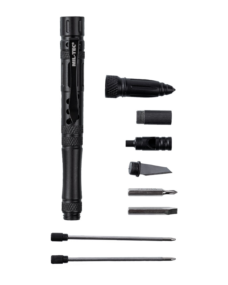 - slitsad och Phillips-klinga, 2 extra kulspetspennor, kniv, visselpipa, Eldstål